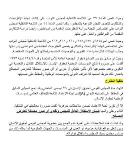 ولفت مقدم المقترح إلى أن المجلس القومي لحقوق الإنسان نجح خلال تشكيله السابق في الحفاظ على تصنيفه الدولي (A) لدى لجنة الاعتماد التابعة للتحالف العالمي للمؤسسات الوطنية لحقوق الإنسان، إلا أن تقرير لجنة الاعتماد تضمن ملاحظات جوهرية تستوجب المعالجة في التشكيل القادم، وفي مقدمتها ضمان الاستقلال الكامل للمجلس وتفادي أي صور محتملة لتعارض المصالح.