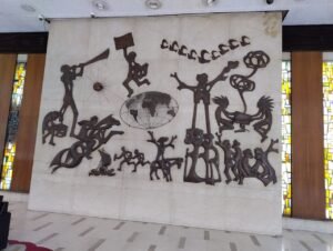 ما إن دخلت من الباب الرئيسي حتى لفت نظري اسم الكاتب الكبير محمد حسنين هيكل معلّقًا على الجدار، في واجهة تخلد دوره في تاريخ المؤسسة، وعلى يسار المدخل وقفت أمام قطعة فنية مصنوعة من النحاس تجسد تطور مراحل الكتابة، وهي إحدى أبرز معالم المكان التي تصف رحلته الممتدة عبر الزمن.