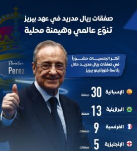 ويلقب بيريز بالقرش الأبيض ومن أكثر الجنسيات التي تعاقد معها الريال في ولايته، هم: ٣٠ لاعباً إسباني مما يعكس اهتماما متزايداً من أبناء البلد، وكان أخرهم ديان هويسين، ألفارو كايراس الصيف الماضي، ١٣ لاعباً من أبناء البرازيل، وكان أبرزهم: روبرتو كارلوس، رونالدو الظاهرة، مارسيلو، فينسيوس جونيور، رودريجو، ميلتاو، كاسيميرو وغيرهم.