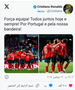 ونشر الدون كريستيانو رونالدو عبر حساباته علي مواقع التواصل الاجتماعي رسالة إلى منتخب بلاده وقال: هيا يا فريق!! معاً اليوم ودائماً من أجل البرتغال ومن أجل علمنا.