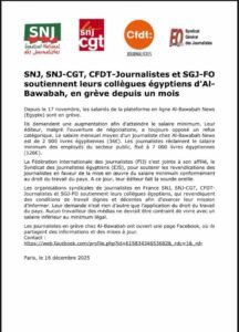 واستطرد: “وتدعم نقابات الصحفيين العامة في فرنسا (SNJ)، ونقابة الصحفيين الوطنية ونقابة الصحفيين العامة (SNJ-CGT)، ونقابة الصحفيين الفنلندية (CFDT-Journalistes)، ونقابة الصحفيين الفرنسية (SGJ-FO) – زملاءهم المصريين الذين يطالبون بظروف عمل كريمة ولائقة تمكنهم من أداء رسالتهم في إعلام الجمهور، ويتلخص مطلبهم في تطبيق قانون العمل المصري، فلا ينبغي إجبار أي عامل في مجال الإعلام على العيش بأقل من الحد الأدنى القانوني للأجور”.