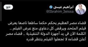 ورد إبراهيم عيسى على الحكم بتويته على موقع “أكس”، قائلاً: ” قضاء مصر العظيم يحكم حكما ساطعا ناصعا بعرض فيلم الملحد ويرفض كل دعاوي منع عرض الفيلم .. الكلمة الآن في يد أجهزة الدولة التنفيذية .. قضاء مصر أعلن قضاءه لا تجعلوا الفيلم ينتظر قدره”.