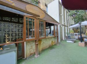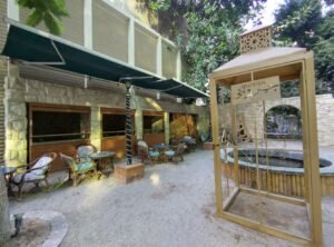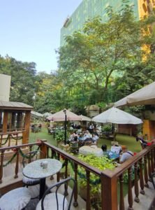 ومن ثم نأتي إلى ما يعد أهم معالم “جروبي”، وهي حديقته الداخلية، التي تشكل مساحة خضراء تمنح الزائرين استراحة من ازدحام وسط المدينة. تحيط الأشجار والنباتات بالطاولات الخارجية، لتوفر ظلًا طبيعيًا يمتص حرارة النهار ويخلق بيئة مريحة وهادئة.
