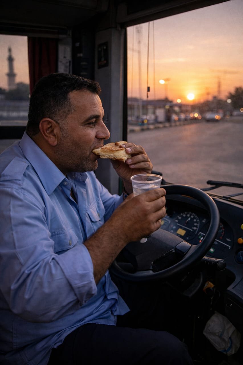 في جيبه ثلاث تمرات ملفوفة في منديل ورقي، وزجاجة ماء دافئة وضعتها زوجته في حقيبته قبل السفر، لا مائدة، لا تجمع عائلي، فقط طريق ممتد، وركاب يراقبون الساعة.