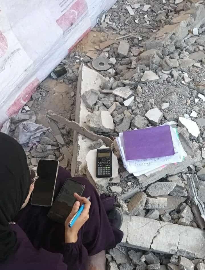 داخل مشهد يلخص قسوة الحرب وإصرار الشباب الفلسطيني على التمسك بحقهم في التعليم، خاضت الطالبة ريتاج امتحان الثانوية العامة عبر هاتفها المحمول، بينما كانت محاطة بالركام بعد قصف البناية التي نزحت إليها مع أسرتها.