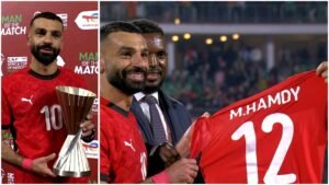 وحرص النجم المصري محمد صلاح، على دعم زميله محمد حمدي، الذي أصيب بقطع في الرباط الصليبي في لقاء بنين من خلال رفع قميصه خلال استلام جائزة رجل مباراة الليلة أمام كوت ديفوار.