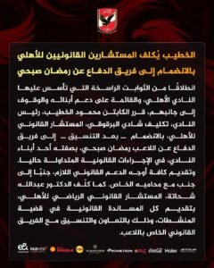 وتضمّن القرار تكليف المستشار القانوني شادي البرقوقي بالانضمام إلى فريق الدفاع عن اللاعب، بعد التنسيق الكامل معه، لتقديم كل أوجه الدعم المطلوبة إلى جانب المحامي الخاص برمضان صبحي.